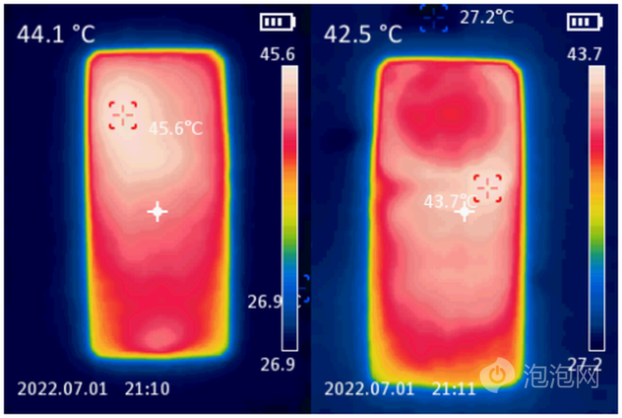 经过实测,30分钟游戏后小米12S Ultra机身正面的最高温度为45.6℃,背面的最高温度为43.7℃,在未进行专门散热的情况下高性能运行30分钟,有这样的温度数据也是不错的表现。