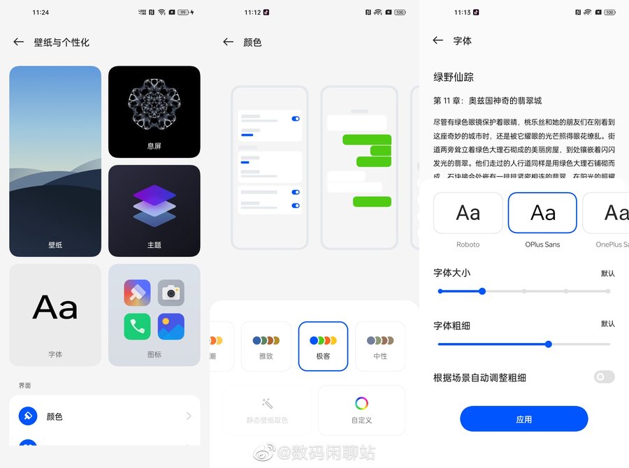 设置界面和主题风格也做了一定的调整,提供更多的自定义选项,原本的OPPO Sans字体也更名为Oplus Sans。