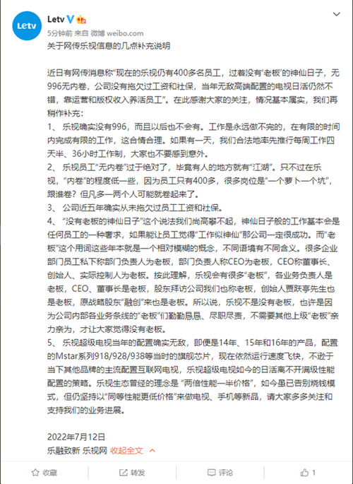 1、乐视确实没有996,而且以后也不会有。工作是永远做不完的,在有限的时间内完成有限的工作,这合情合理。如果有一天,我们合法地率先推行每周工作四天半、36小时工作制,大家也不要感到意外。