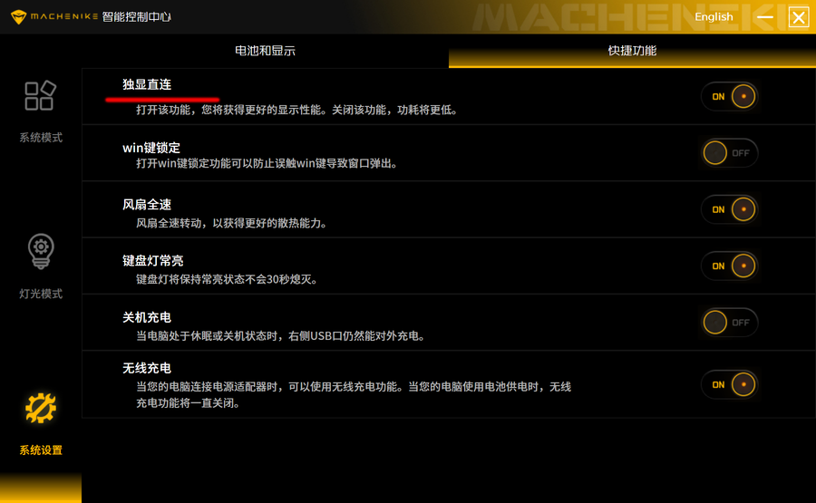 开启英特尔锐炫A730M独显直连的方法很简单。在MACHENIKE智能控制中心里面的“系统设置-快捷功能”界面下,开启独显直连即可。