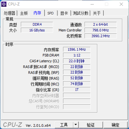 16GB(8GB×2) DDR4-3200MHz內存,搭配12代酷睿也能够带来不俗的性能表现。根据CPU-Z识别的信息来看,这套16GB(8GB×2) DDR4-3200MHz內存默认是在Gear2(1:2)内存分频模式下运行的。
