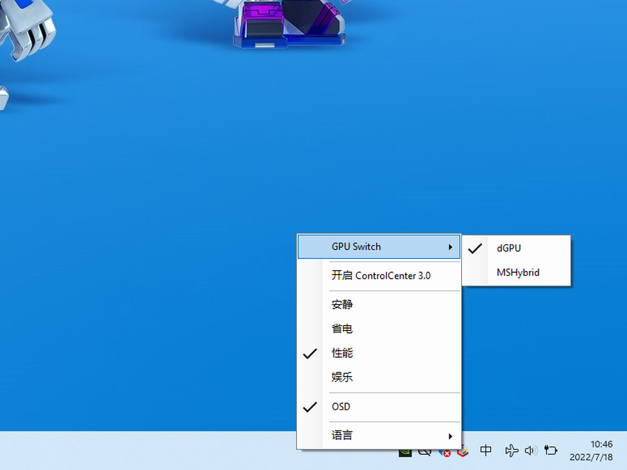第一种方法,右键单击CONTROL CENTER控制软件的小图标,将GPU Switch选项设置为dGPU,即是独显直连模式。