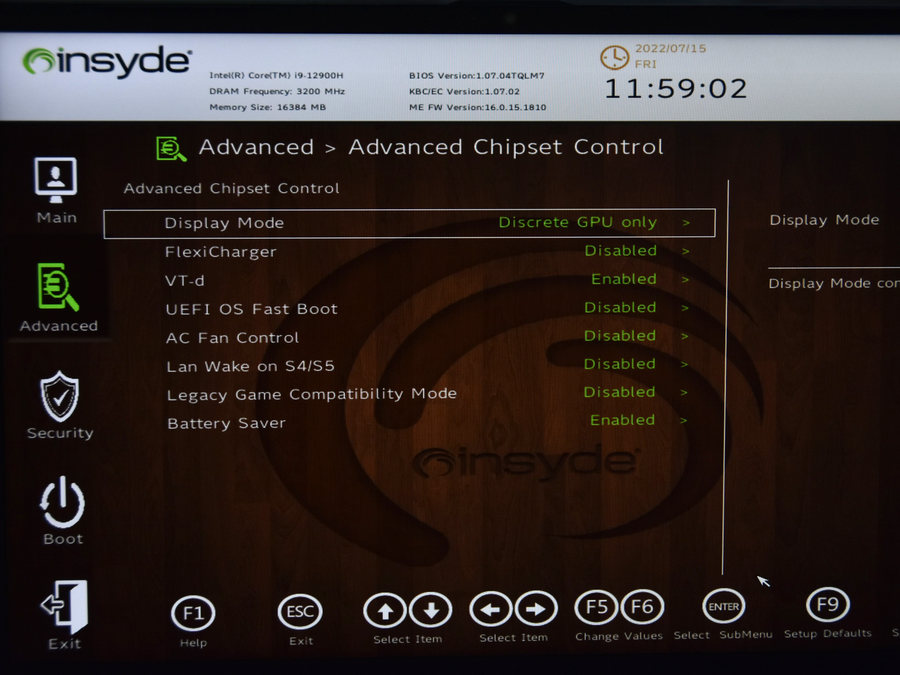 第二种方法,开机进入电脑BIOS,在Advanced>Advanced Chipset Control界面下,将Display Mode(显示模式)设置为Discrete GPU only,即是独显直连模式。
