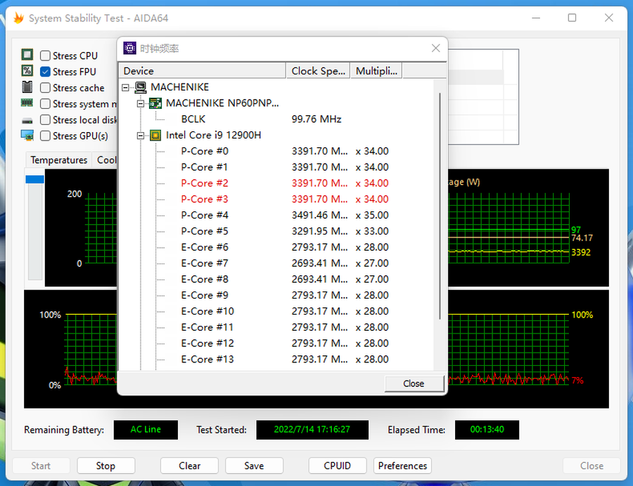 单烤CPU。开启FPU烤机10分钟之后,CPU温度稳定在了约97℃左右,此时CPU功耗稳定在了约74W。