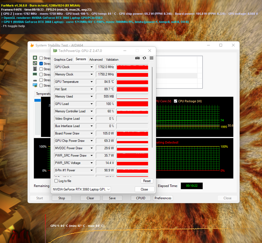 开启CPU+GPU双烤机10分钟之后,这款游戏本的CPU+GPU的功率输出总和约为135W。此时,这款游戏本的CPU温度稳定在了74℃左右,此时CPU功耗稳定在了约30W。GPU温度稳定在了约84.5℃左右,此时GPU功耗稳定在了约105W。
