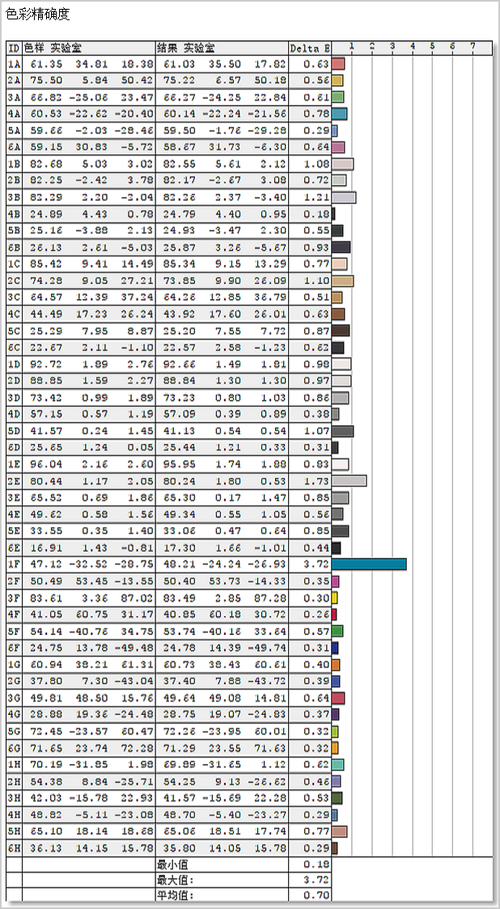 平均△E为0.7,△E≥3的颜色只有一种。这块屏幕的色准也很不错。