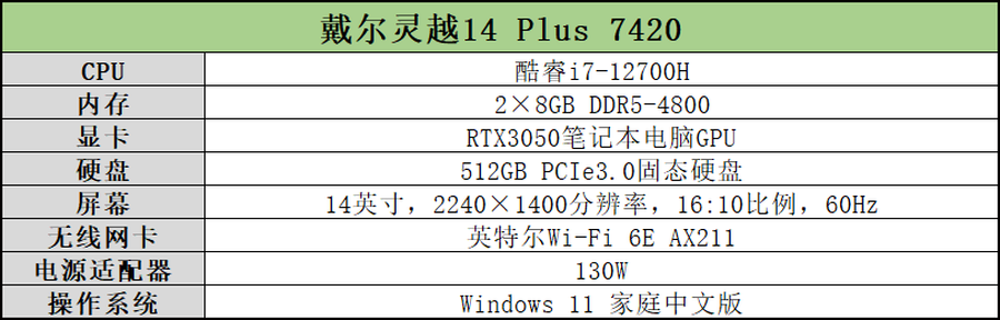 12代酷睿i7-12700H标压处理器、RTX3050笔记本电脑GPU、2×8GB DDR5-4800MHz内存、14英寸2.2K物理防蓝光屏幕,这就是笔者手中这款灵越14 Plus 7420的硬实力。