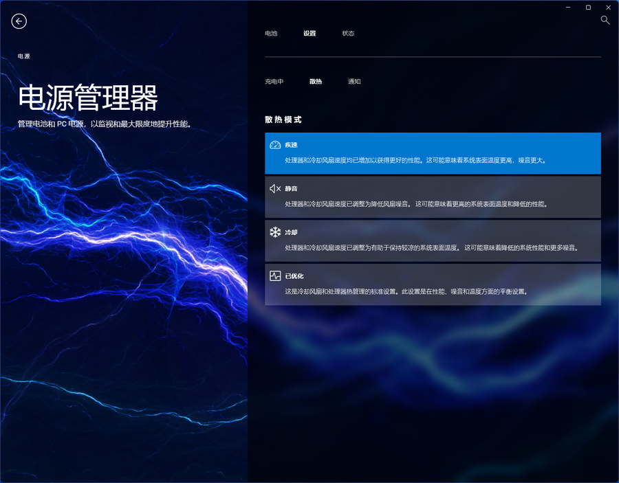 在功率界面下,可以对电池、散热模式等方面进行设置。