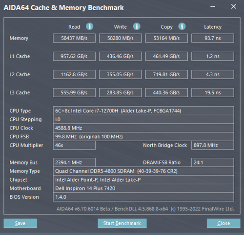 灵越14 Plus 7420搭配了两根DDR5内存,以“四通道”模式运行模式。其内存读取、写入、复制的性能均不错。