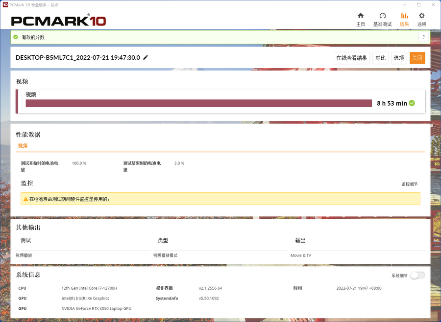 利用PCMARK 10,笔者继续对这款笔记本进行了续航能力实测。