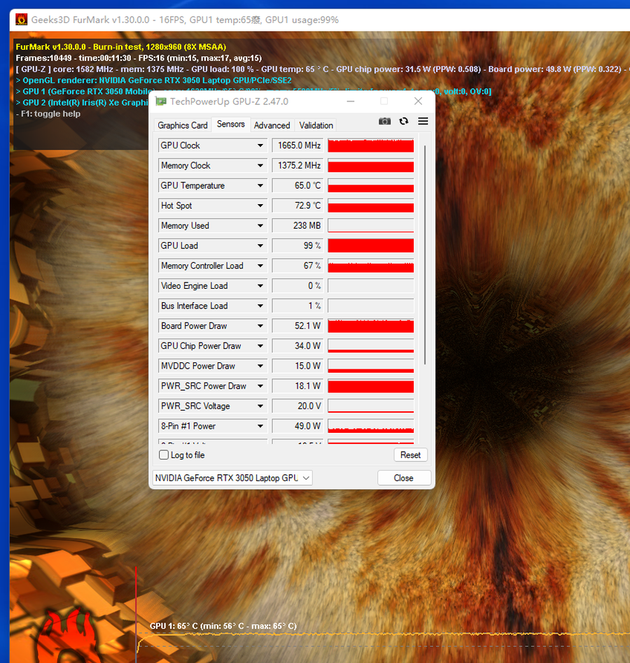 单烤显卡。开启FurMark烤机10分钟之后,这款笔记本的GPU温度稳定在了约65℃左右,GPU功耗最高可达52W。