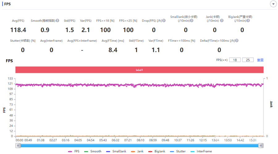 在《王者荣耀》游戏中,Redmi K50至尊版可以以120帧的帧率运行游戏,我们使用PerfDog来对手机的游戏帧率进行测试,经过一局游戏,Redmi K50至尊版运行《王者荣耀》的平均帧率为118.4FPS,在整个游戏过程中画面流畅,可以明显感受到超高帧率带来的游戏体验升级。