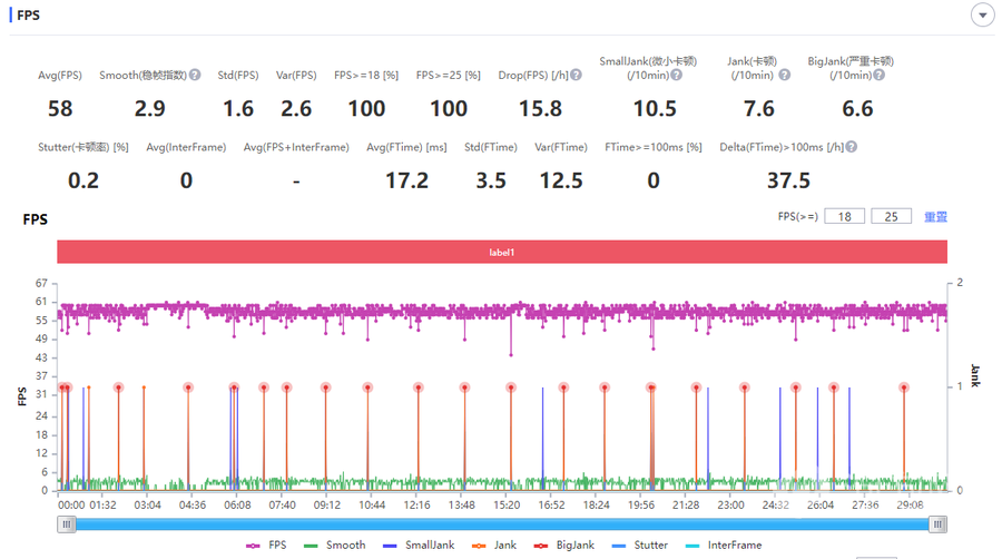 《原神》选择极高画质,在60FPS模式下运行30分钟,PerfDog显示Redmi K50至尊版的平均帧率为58PFS,在30分钟时间内也没有明显的降帧出现。如果是追求极致流畅的用户,可以在低画质下运行《原神》,这样在流畅度方面也会有进一步的提升。