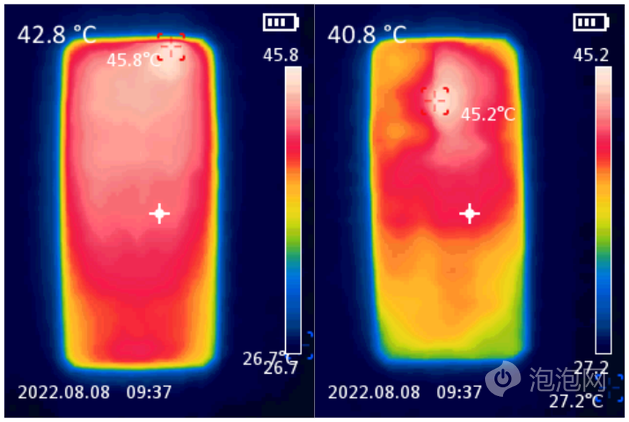 经过实测,在30分钟《原神》之后,机身正面的最高温度为45.8℃,机身背部的最高温度为45.2℃,对于温度的控制还是非常好的。