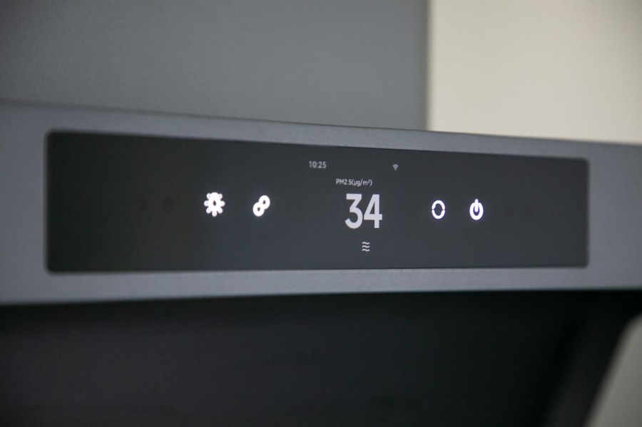 米家智能净烟机P1采用了触控的按键设计,同时米家智能净烟机P1还支持手势操作,可以通过挥手的方式来实现风速的切换,操作方便。在按键中间有一块屏幕,可以显示时间、风速以及PM2.5数据。