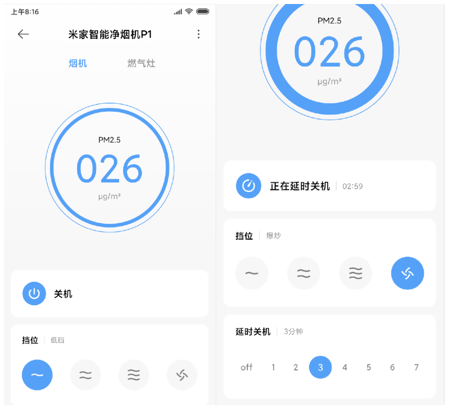 米家智能净烟机P1支持延时关机,当烹饪完毕,可以持续运行,并自动关机,从而起到净化厨房空气的能力。