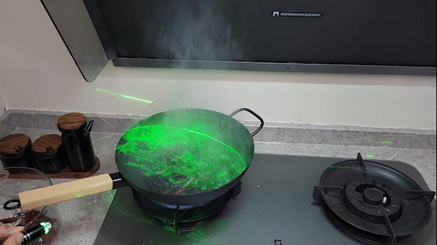 在工作的时候,米家智能净烟机P1通过空气动力学远离,由低压气旋从源头来捕集油烟、气味、PM2.5等烹饪污染颗粒,通过激光照射我们可以看到在锅的上方有明显的气旋产生。