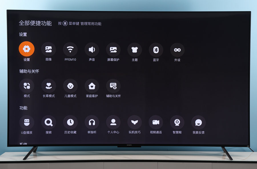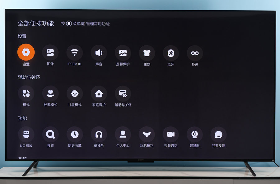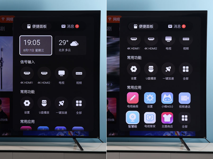 在功能交互与使用上,创维90A23追求的是直观与简洁。通过遥控器中间最右侧的快捷按键,我们可以呼出快捷面板,方便我们快速发现并找到常用的设置以及应用。而屏幕上方的状态栏还有天气显示,并且各个接口的状态也一目了然。