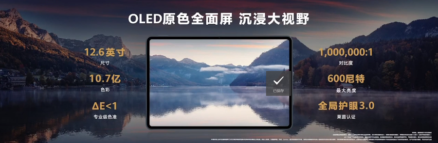 首先,在屏幕配置方面,华为MatePad Pro 12.6英寸相比上一代具有更高的刷新率、更好的色彩,其配备120Hz刷新率的OLED原色全面屏,具有2560x1600高分辨率和240 PPI的高像素密度,屏占比达到90%;同时这款苹果拥有1000,000:1高对比度、10.7亿色和P3广色域,Delta E<1的色准表现,屏幕素质非常出色;此外,这款最新的华为MatePad Pro采用硬件低蓝光技术,支持1440Hz 高频PWM调光,降低屏幕频闪,减少长时间用眼的不适。而在娱乐音影方面,支持HUAWEI SOUND音频,并设计了高低分频8喇叭,最高可达到79dB响度,音效也十分震撼。