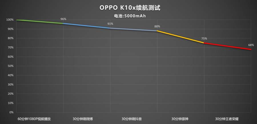 首先我们来看看OPPO K10x的续航表现如何吧。我们从100%满电开始测试,开启手机的120Hz模式,通过在线观看1080P视频、刷微博、抖音、玩游戏来进行测试。基本上一些常规的娱乐影音体验OPPO K10x都有非常不错的表现,两个小时不间断的刷视频电量还能维持在88%左右。而在游戏环节中,《原神》和《王者荣耀》都开启了60帧高画质模式,一个小时的游戏下来,也还有接近70%的电量。如果只是日常使用的话,OPPO K10x续航一整天完全没问题。