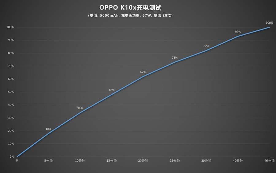 在充电测试环节,实测OPPO K10x从没电关机状态到充满电需要46分钟左右,这个充电速度还是很快的,要知道OPPO K10x内置的不是4000mAh或4500mAh的电池,而是5000mAh的大电池,更何况手机半小时就能充电80%以上,完全能应付外出一天的续航需求。并且,OPPO K10x采用智能五芯安全防护,通过闪充鉴定、接口过载等保护措施,从充电头到接口再到手机内部电池,疾速充电的同时更有全方位的安全防护。