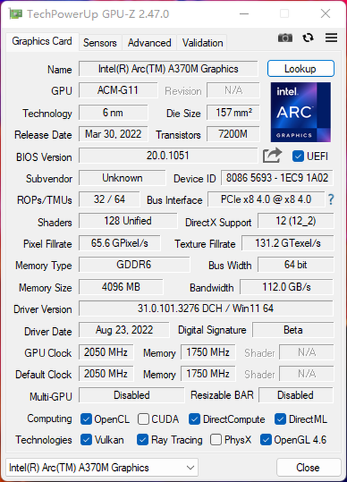 锐炫A370M基于ACM-G11显示核心设计,内建有6个Xe内核、6个光线追踪单元、128个执行单元(EU),搭配有64bit位宽、4GB容量的GDRR6显存,虽然它只是锐炫A系列移动显卡的入门级型号,但是依然具备了英特尔先进的Xe内核、Xe媒体引擎、Xe显示引擎、Xe图形管线。特鄙视,Xe媒体引擎——Xe媒体引擎可以为众多视频编解码器提供加速并支持广泛的行业标准,同时还支持业界领先的AV1硬件加速编解码,能够在视频创作方面大显身手。