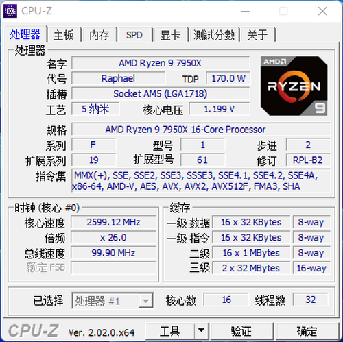 新一代Zen 4处理器没有继续增加核心数量。锐龙9 7950X这款旗舰处理器依旧维持在了16核心、32线程的水平。它的国内首发价格为5499元。