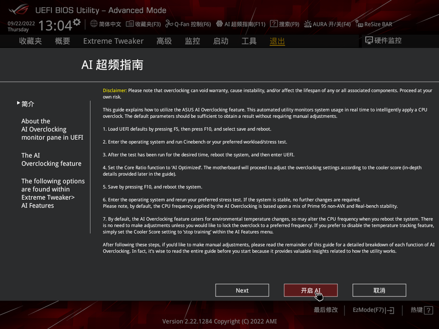 在“AI超频指南”界面,点击“开启AI”,这款ROG主板便会对处理器进行AI超频。