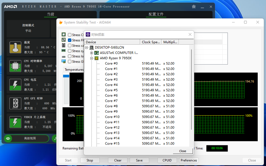 锐龙9 7950X在AI超频状态下,全核心频率可以到达5.1GHz,最大加速频率可以到达5.2GHz。