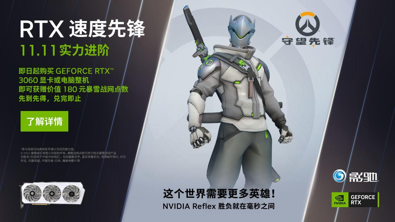 2022年10月31日至2022年11月11日,在指定店铺购买影驰GeForce RTX 3060显卡或搭载影驰 GeForce RTX 3060显卡的电脑整机,确认收货,且七天内并未产生退货,即可获赠价值180元人民币的暴雪游戏点数(兑换截止时间:2022年11月30日),数量有限,先到先得,兑完即止。