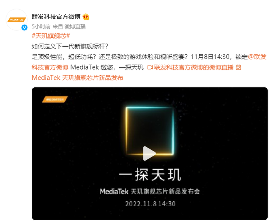 11月1日消息,在今日,联发科在正式官宣将会在11月8日14点30分正式举办天玑旗舰芯片新品发布会。而根据目前的爆料信息显示,联发科此次发布的产品应该是天玑9200芯片。