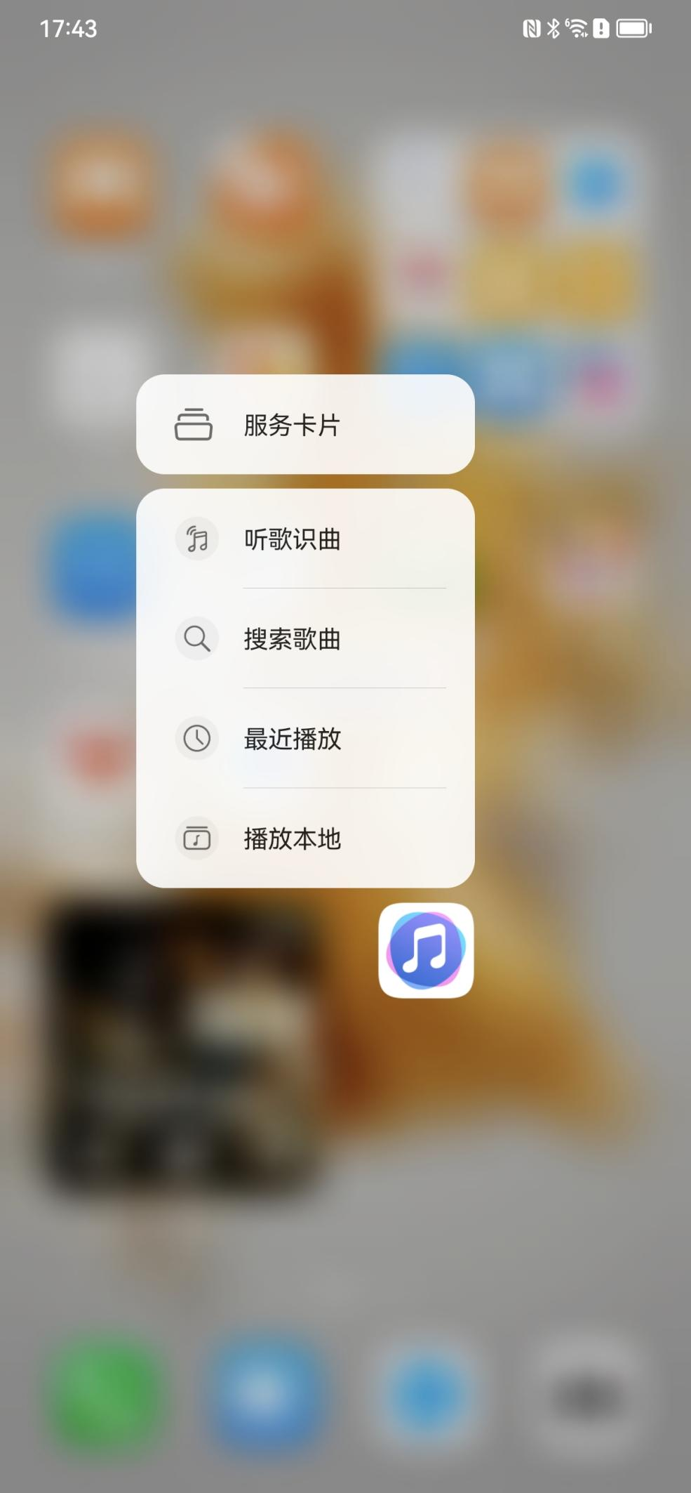 在运行鸿蒙系统的华为手机桌面,用户可直接上滑华为音乐图标查看当前正在播放的音乐。包括切歌、暂停、收藏的高频操作均可在桌面完成,无需进入应用本身,也无需进入控制中心。长按华为音乐图标,还能激活服务卡片,包括听歌识曲、搜索歌曲、最近播放、播放本地也能一步搞定。