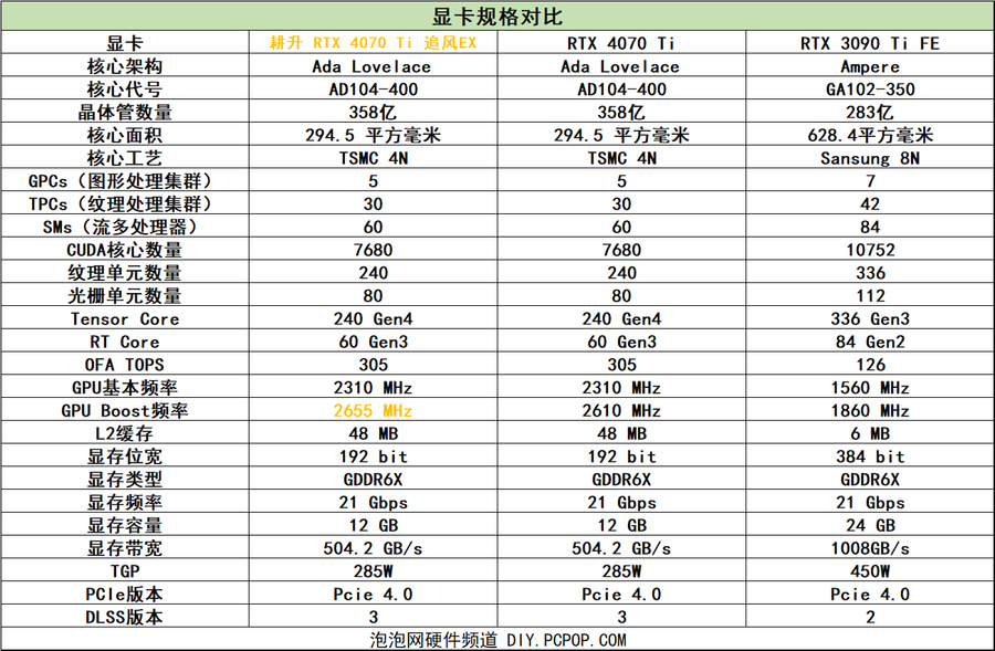 耕升 GeForce RTX 4070 Ti 追风EX是一张RTX 4070 Ti显卡,RTX 4070 Ti配备的是AD104核心,采用了TSMC 4N工艺进行制造,其芯片的面积为294.5 平方毫米,晶体管的密度为358亿,从晶体管的密度来说,其相比较于上一代“卡皇”RTX 3090 Ti的283亿晶体管数量也不逊色。