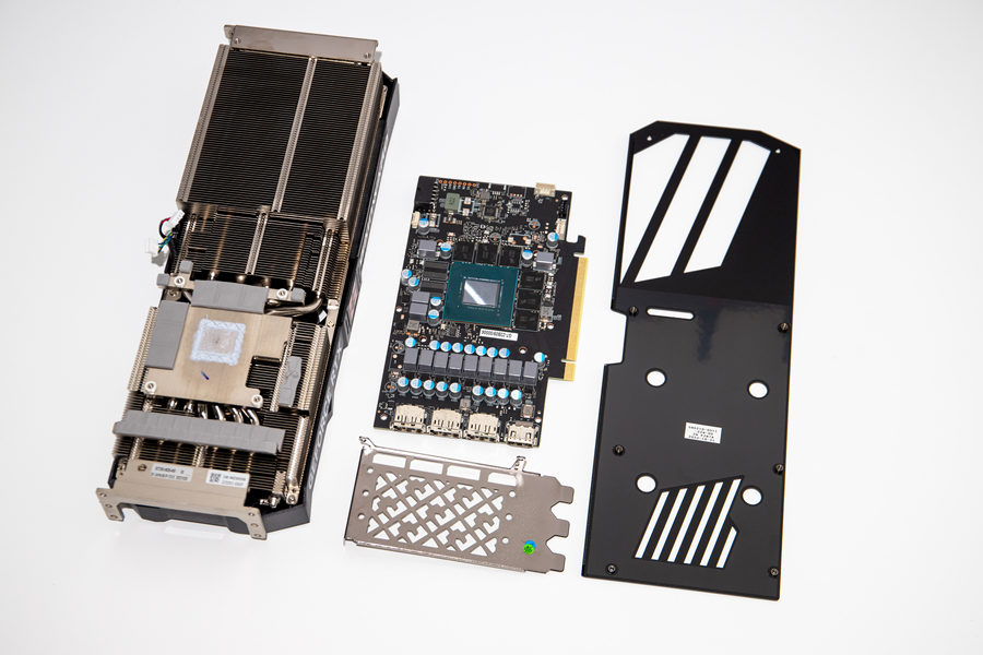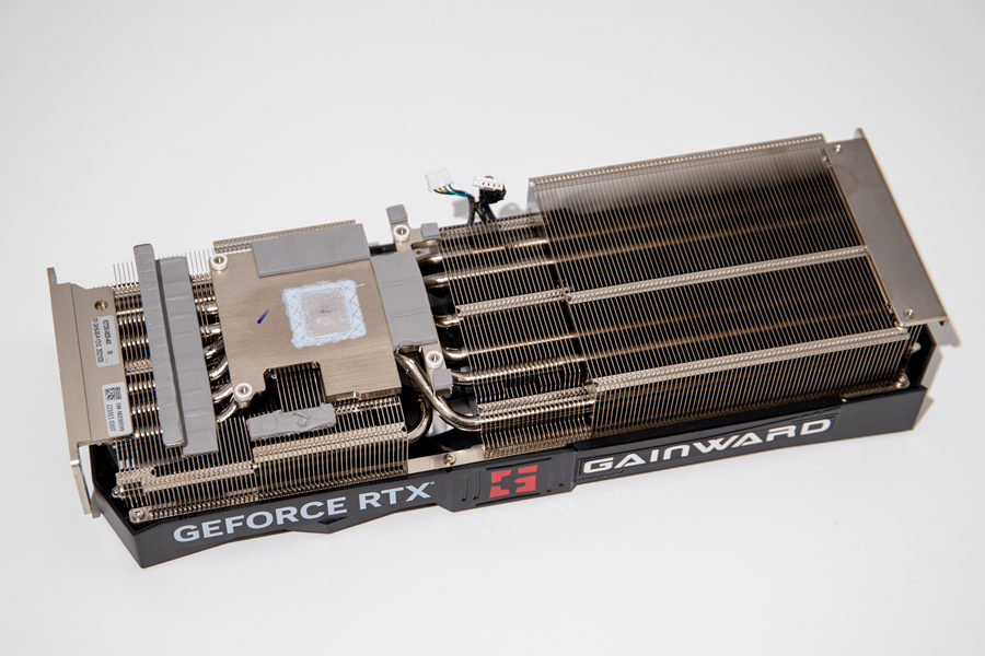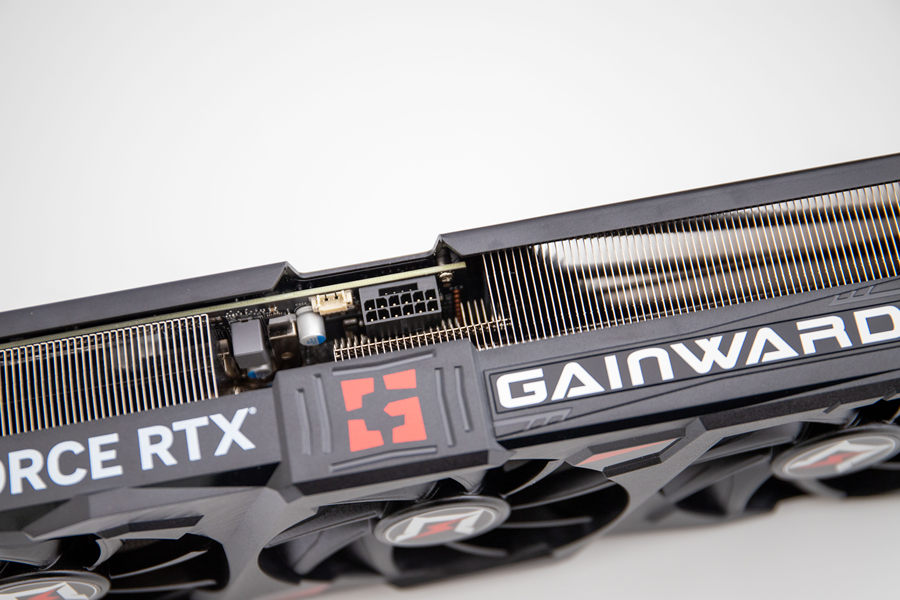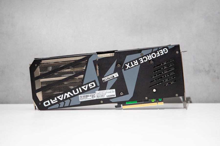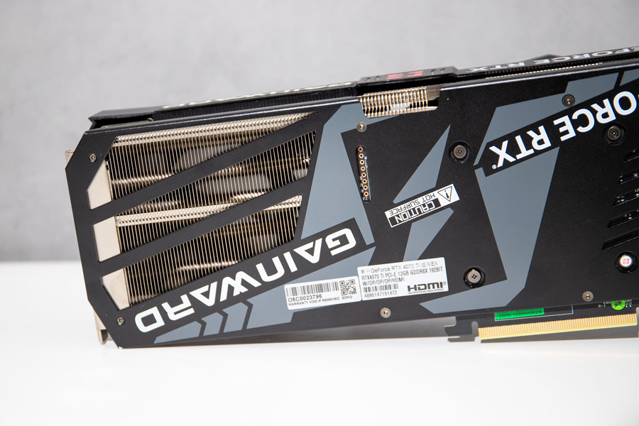 耕升 GeForce RTX 4070 Ti 追风EX采用了金属背板,通过金属背板来提升显卡的强度以及散热性能。我们可以看到其在在背板上印制有“GeForce RTX”的字样和 NVIDIA 核心AIC之一“耕升”的英文名称。在金属背板的尾部,耕升对这一个部位进行了镂空处理,这一个设计可配合散热器上第三组风扇的风流直接穿透散热鳍片以及镂空的PCB设计,让显卡温度有进一步的下降。