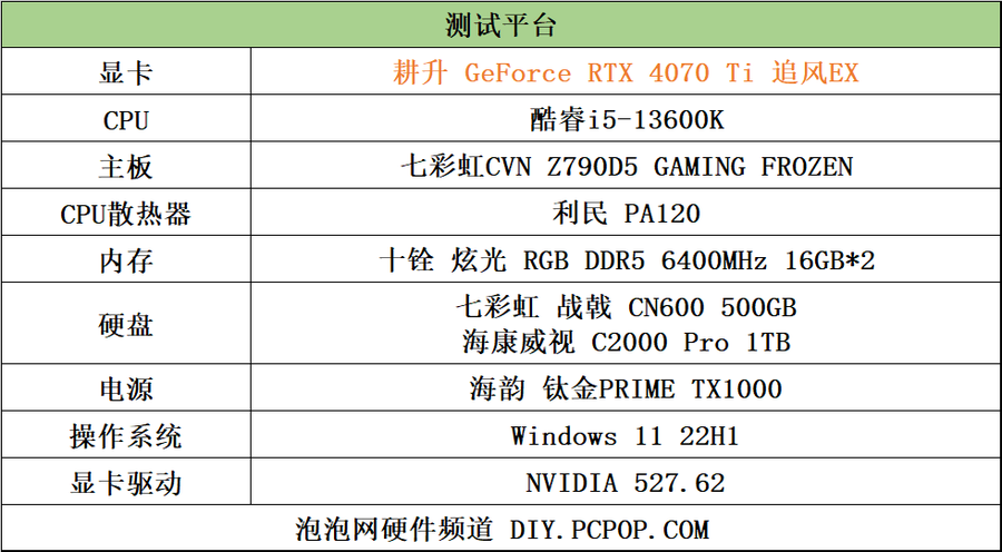 我们搭建了一套高性能的测试平台来对耕升 GeForce RTX 4070 Ti 追风EX进行测试,测试平台的具体配置可看下图。