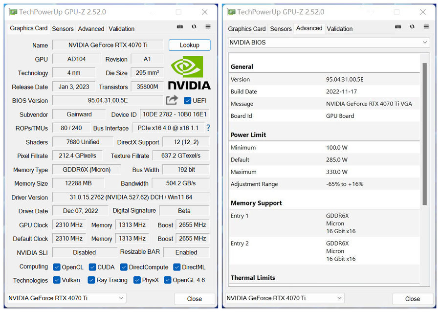 通过GPU-Z我们可以查看到这一张耕升 GeForce RTX 4070 Ti 追风EX的部分信息,可以看到其频率为2655MHz,默认的TGP为285W。