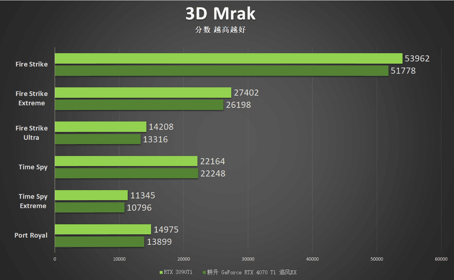 首先笔者进行了3D Mark的相关测试,在3D Mark的理论测试中。耕升 GeForce RTX 4070 Ti 追风EX的理论得分与RTX 3090 Ti非常接近,差距非常小。