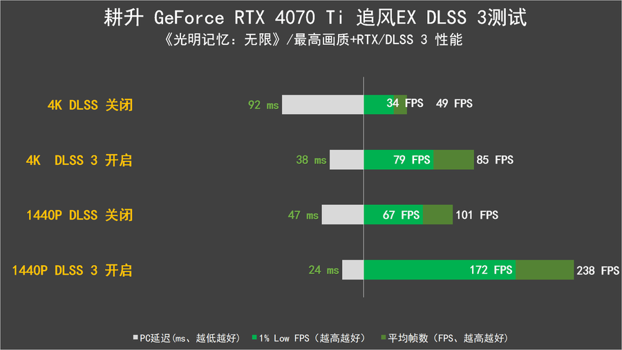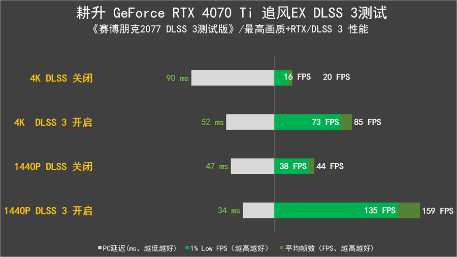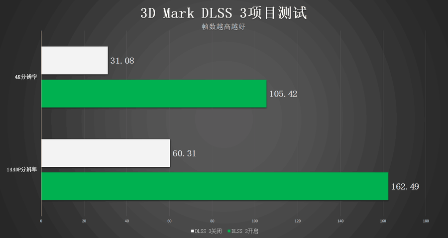 耕升 GeForce RTX 4070 Ti 追风EX支持DLSS 3技术,因此笔者也通过3D Mark中的DLSS 3项目对其进行了DLSS 3的理论性能测试。在测试中可以看到,耕升 GeForce RTX 4070 Ti 追风EX相比较于未开启DLSS 3,帧数有了大幅度的提升,在4K分辨率的情况下,提升幅度达到300%以上。而在1440P的分辨率中提升则是接近250%。