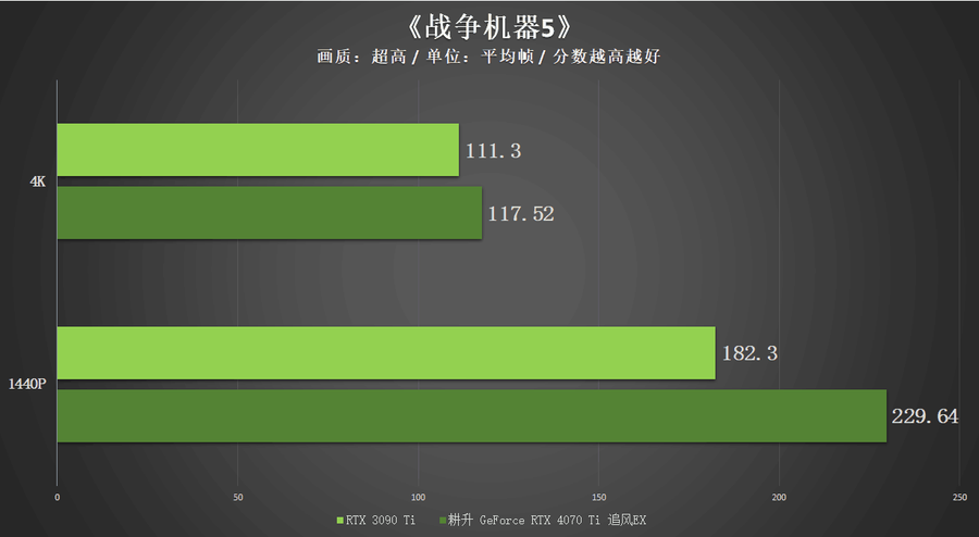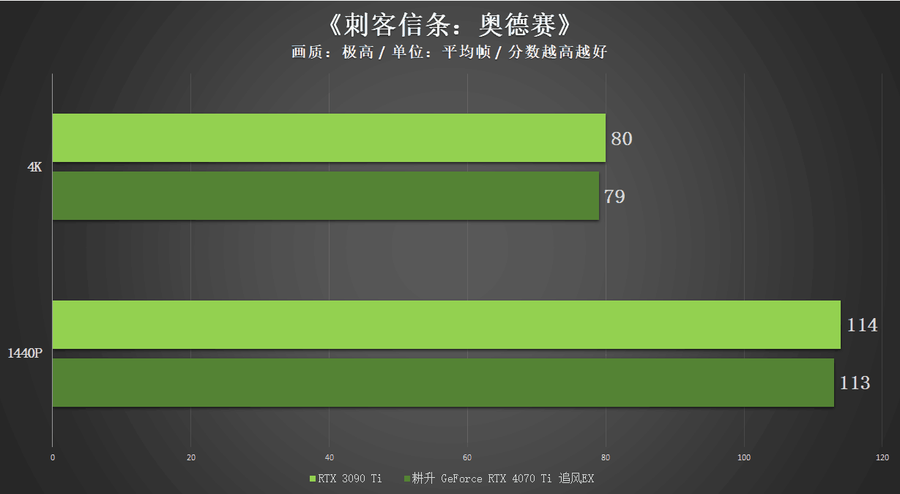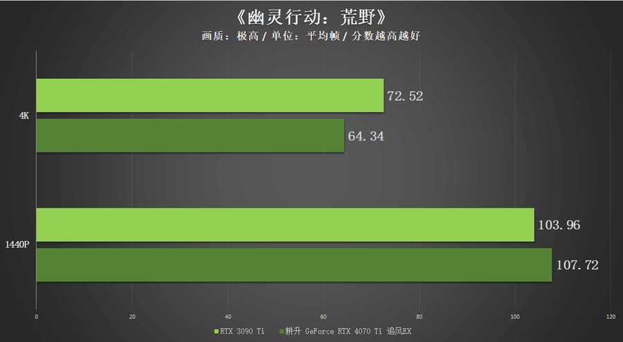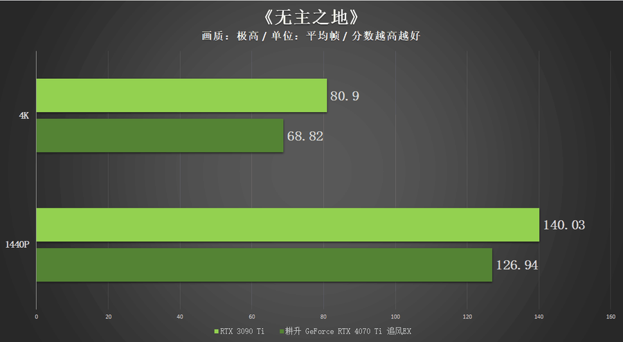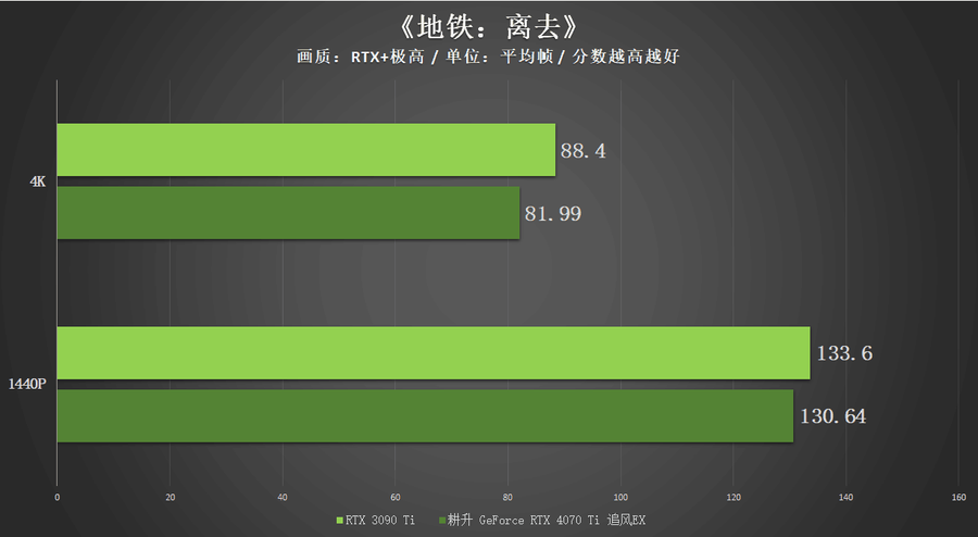 在两款开启光线追踪技术的游戏中,得益于RTX 4070 Ti核心在光追性能方面的提升,耕升 GeForce RTX 4070 Ti 追风EX在1440P以及4K分辨率中的表现和RTX 3090 Ti这一上代的“卡皇”非常接近。