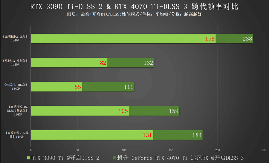 而得益于英伟达对于游戏工作室在游戏开发过程所提供的支持,采用DLSS 3技术的游戏应该会越来越多,因此笔者也对于支持DLSS 3的游戏进行了相对应的测试。由于RTX 3090 Ti未能实现DLSS 3的支持,因此在这部分的游戏测试中,RTX 3090 Ti只能以开启DLSS 2的方式与支持开启到DLSS 3的耕升 GeForce RTX 4070 Ti 追风EX进行对比。