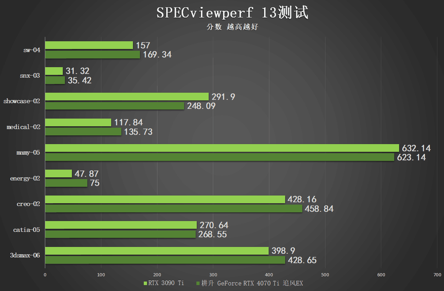 在SPECviewperf 13的基准测试中,笔者将耕升 GeForce RTX 4070 Ti 追风EX与上一代的“卡皇”RTX 3090 Ti进行了一番对比,可以看到在绝大部分项目上,RTX 4070 Ti的专业生产力表现和上一代的“卡皇”相差无几,甚至是在部分的项目上实现了反超。