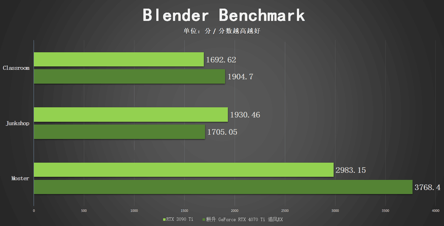 在渲染方面的测试上,笔者通过Blender Benchmark对耕升 GeForce RTX 4070 Ti 追风EX与RTX 3090 Ti进行了对比测试。通过对比数据可以看到,RTX 4070 Ti在三个场景中的其中两个都相比较于RTX 3090 Ti获得了更优的成绩。
