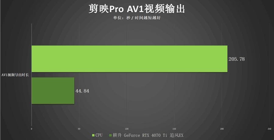在对同一段30GB的视频渲染到AV1的过程中,笔者采用耕升 GeForce RTX 4070 Ti 追风EX的硬解编码加速和CPU的软解编码进行对比。可以看到耕升 GeForce RTX 4070 Ti 追风EX仅用时44.84秒就完成了AV1视频的渲染,而采用CPU软解编码则需要到205.78秒才可完成。