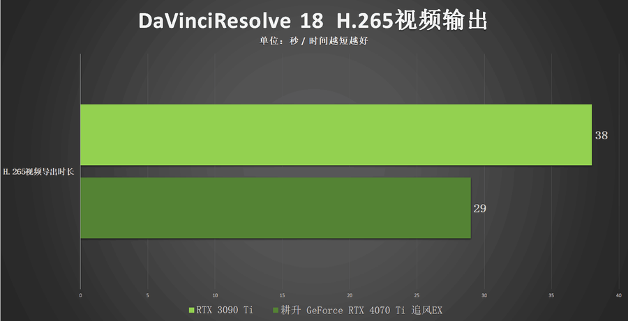 除了对AV1的格式的支持以外,RTX 4070 Ti也对于目前的H.265/H.264格式有相对应的支持提升。在笔者的测试中,笔者使用达芬奇对同一段视频生成为H.265格式4K分辨率进行输出,耕升 GeForce RTX 4070 Ti 追风EX耗时仅为29秒,作为对比的RTX 3090 Ti则耗时为38秒。