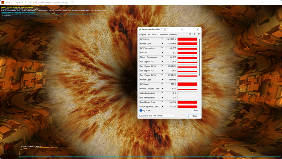 在使用FurMark烤机测试15分钟后,耕升 GeForce RTX 4070 Ti 追风EX的显卡温度稳定在62℃左右、显卡风扇转速在1320转左右、功耗在260W附近。从表现来看,可谓是凉快又安静了。