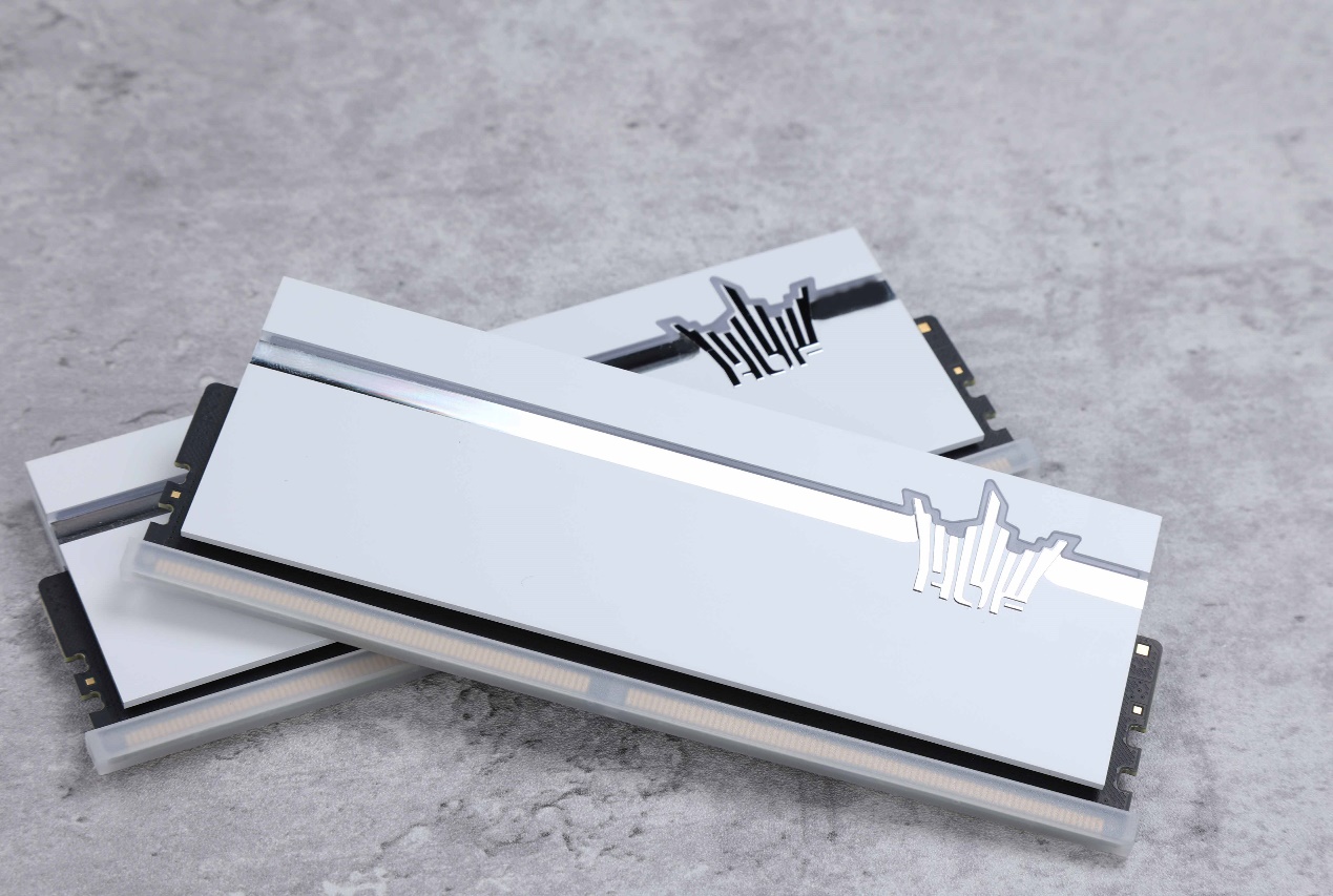 回到HOF PRO DDR5内存产品本身,相比上一代D4内存,这一代的HOF PRO DDR5内存在整体质感上有了全新的升级。外观上沿用了系列一贯的银白配色,全新的纯白散热马甲采用了金属电泳白工艺,无论从触感还是视觉上都有所提升。侧面造型细节部分则采用了金属喷砂工艺,标志性的亮银HOF LOGO在不同光线角度下都能完 美呈现,带来不一样的光泽质感。