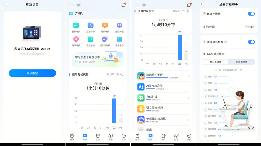 家长可在守护助手上查看孩子的学习情况以及坐姿情况