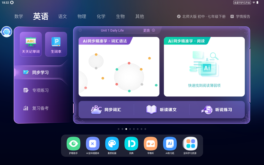 同样都是学英语,科大讯飞AI学习机T20 Pro并没有笼统的使用相同的UI设计与模板,而是通过在个人设置中选择相应的年级后,有针对性的进行“精准学”。