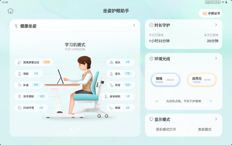 当学习机检测到坐姿有问题时会在屏幕显示通知并有语音提醒