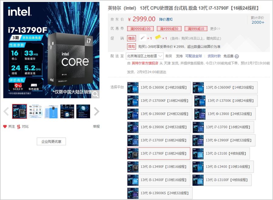 英特尔酷睿i7-13790F处理器开售,首发价2999元。跟酷睿i5-13490F一样,这款新i7同样主打游戏平台,同样仅在我国市场上销售。